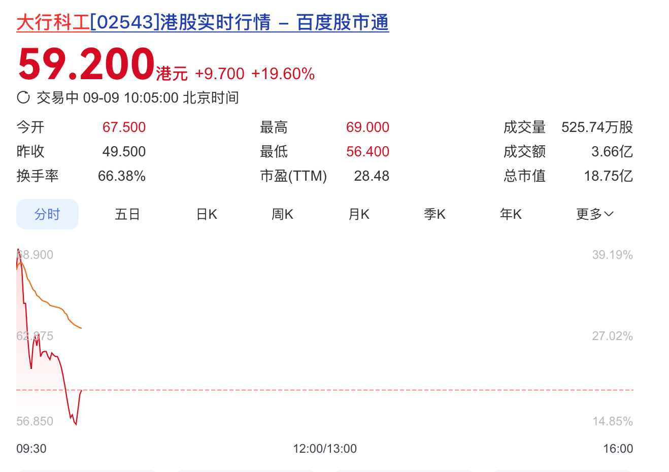 此前一天,其先在散户暗盘交易场预先交易,在富途交易场一度涨203%报150港元,最终富途暗盘收涨58.99%报78.7港元。截至发稿,大行涨19.6%报59.2港元,总市值18.75亿港元。