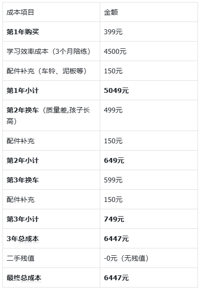 本文基于初始价格、学习效率成本、配件补充成本、使用年限、二手残值5大维度,深度计算500/1000/2000元档儿童自行车的**3年真实总成本**,用数据说话,帮您找到真正高性价比的选择。