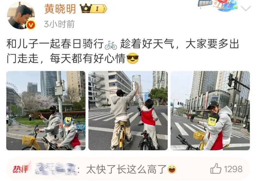 4月4日,黄晓明在微博上分享了一组照片。照片中,他骑着共享单车,9岁的儿子则骑着一辆普通儿童自行车,两人在人行道前击掌、合影,阳光洒在父子身上,画面温馨自然。黄晓明配文表达了对亲子时光的珍惜,这本该是一次普通的家庭分享。