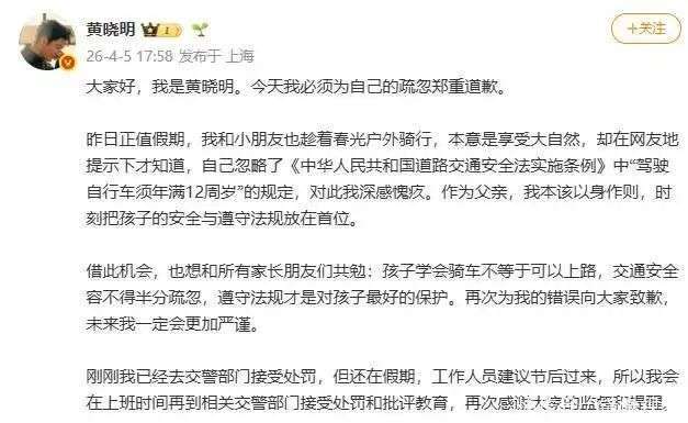 《中华人民共和国道路交通安全法实施条例》第七十二条明确规定,驾驶自行车、三轮车必须年满12周岁。未满该年龄的未成年人上路骑行,不仅自身缺乏足够的应急反应能力,也可能给公共道路安全带来潜在风险。意识到问题的严重性后,黄晓明立即删除了原博文,并于4月5日公开发布致歉声明,体现出对错误的及时反思和负责任的态度。