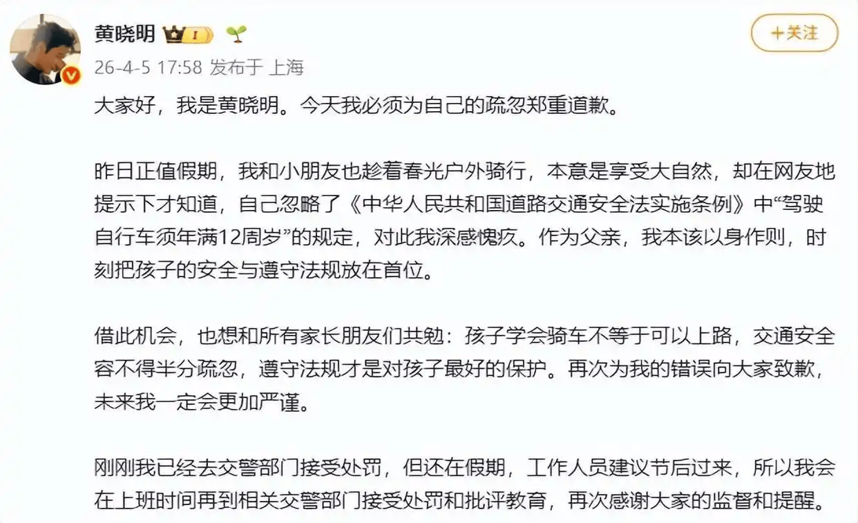 黄晓明对着全网说“我错了”,这姿态本身就告诉孩子:认错不是软弱,是力量。