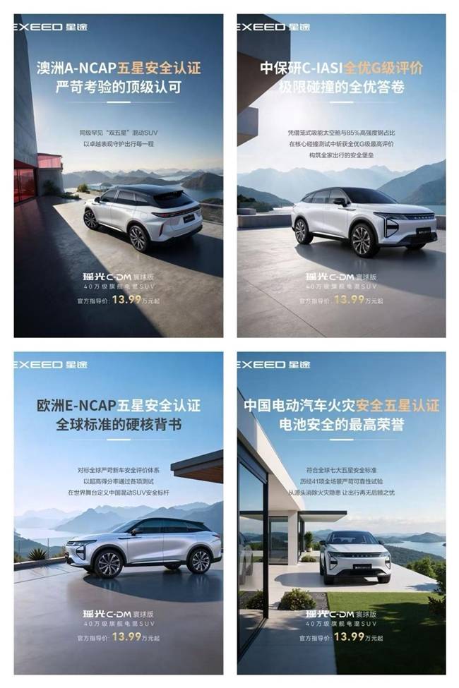 瑶光上市以来,其安全实力不容小觑,先后斩获了C-IASI 中国保险汽车安全指数全优G级评级、ENCAP、ANCAP五星安全评级。安全不分“左舵”“右舵”,成为同级唯一获双五星认证的混动SUV。同年,瑶光C-DM成功在人工制造的800℃高温电芯加热触发热失控测试中,凭借电池包无明火、无爆炸的表现,成果获得中国电动汽车火灾安全指数 (C-EVFI) 五星认证。