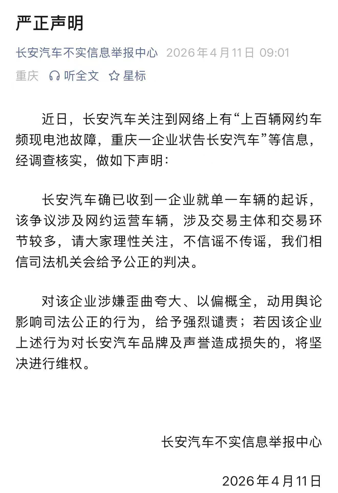 面对微笑出行的声明,长安汽车方面称,网约车辆运营企业涉嫌歪曲夸大、以偏概全、动用舆论影响司法公正的行为,若该企业行为对长安汽车品牌及声誉造成损失,长安汽车将坚决进行维权。