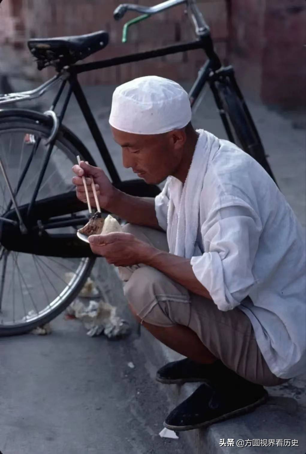 1988年,西安街头,一位大哥蹲在路边吃粽子。照片中的他身穿白色衬衫,戴着标志性的白帽子,显然是的装束。西安是一个多民族的城市,文化在这里有着深厚的根基。这位大哥手中拿着两个粽子,白色的是糯米粽,稍深颜色的可能是红枣或红小豆粽。西安的粽子因其香糯可口而闻名,成为当地的特色小吃,既能解饿又能满足口腹之欲。