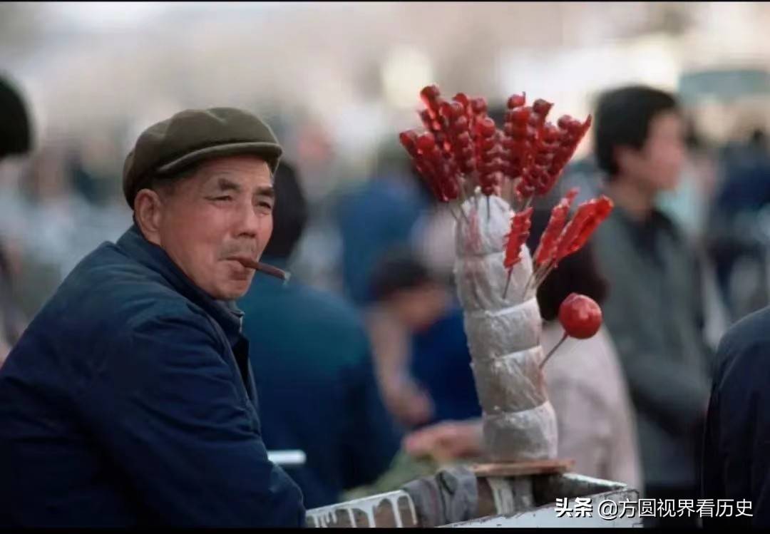 1987年,西安街头,卖糖葫芦的大叔戴着蓝帽子,嘴里叼着一根土烟,双手插在袖口里,悠闲地等待着顾客。糖葫芦的卖家大多骑着自行车,穿梭于西安的大街小巷。这位大叔的糖葫芦摊上,不仅有传统的山楂糖葫芦,还有蜜枣和苹果糖葫芦。对于80年代的孩子们来说,糖葫芦是难得的美味,尤其在寒冷的冬天,吃上一串甜美的糖葫芦,成了他们最开心的事。