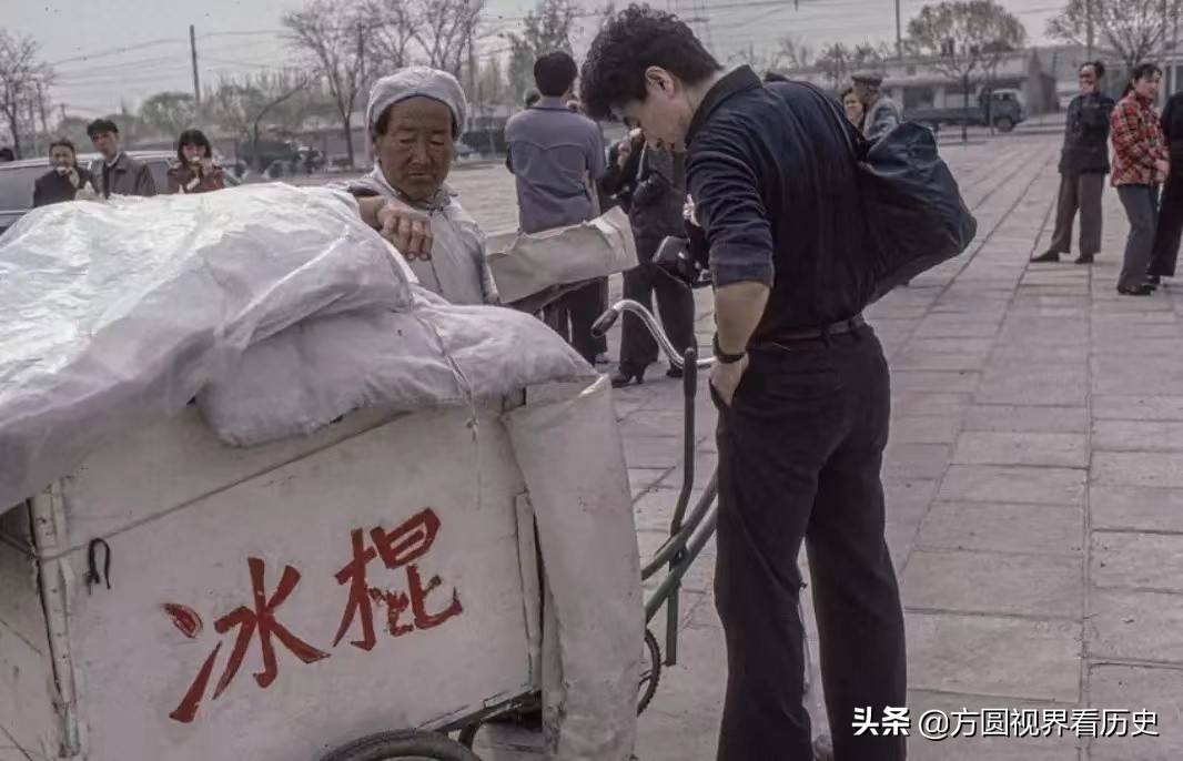 1984年,西安街头有一位卖冰棍的大叔,他推着三轮车在广场上卖冰棍。那个时候还没有现代的冰箱和冷藏柜,卖冰棍的人们通常用木箱装冰,并用棉被包裹,防止冰棍融化。这位大叔的冰棍箱外面也包着厚厚的棉被,确保冰棍保持冰凉。这些简单的生活细节,显得朴素而温馨。照片中,一位背挎包的年轻游客正在购买冰棍,可能他是来西安办事或旅游的外地人。80年代中期,经济复苏,西安也吸引了越来越多的游客,尤其在炎热的夏天,冰棍成了最受欢迎的消暑小吃。